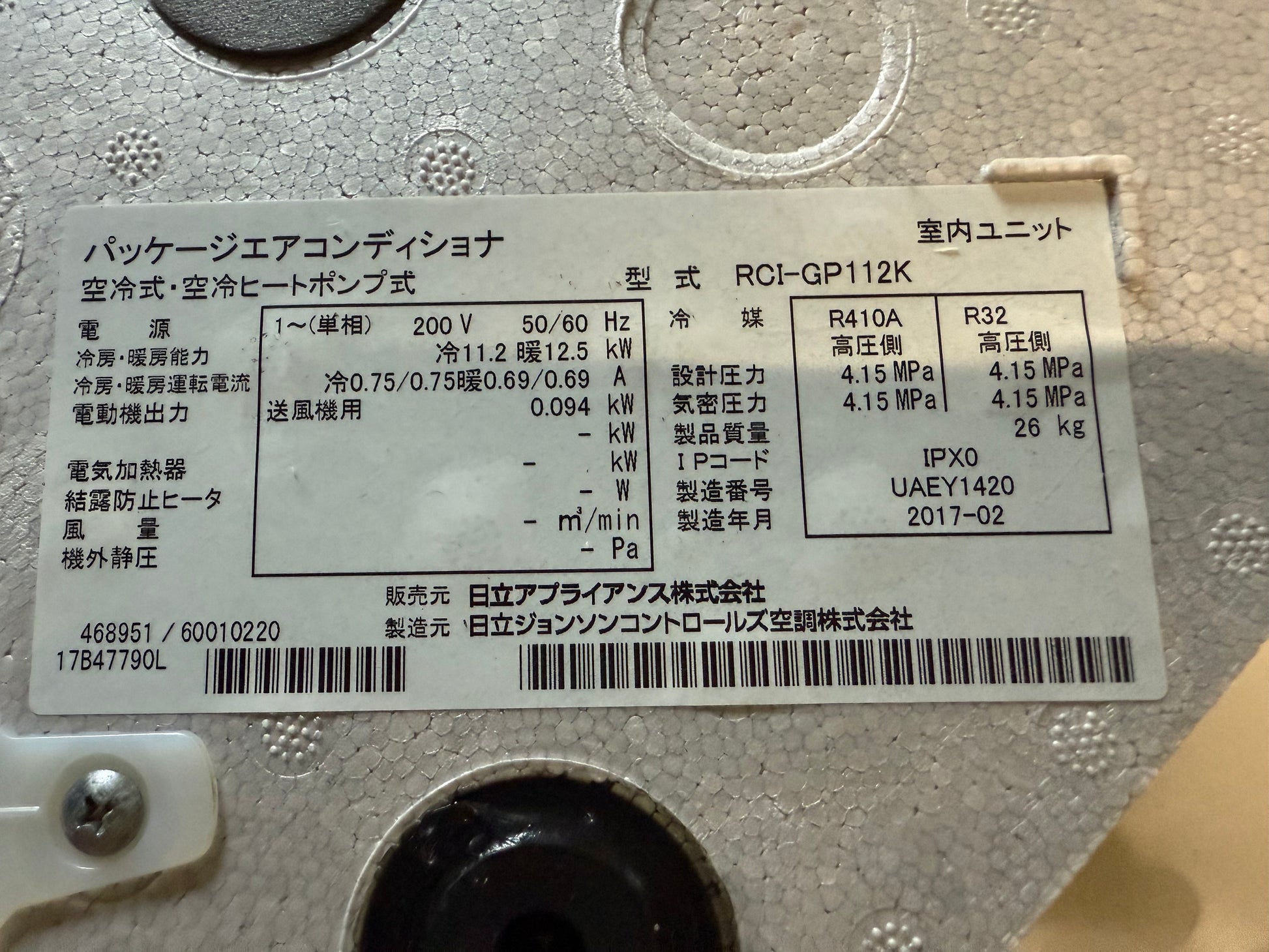 型番:内機:RCI-GP112K     外機:RAS-GP112RGH